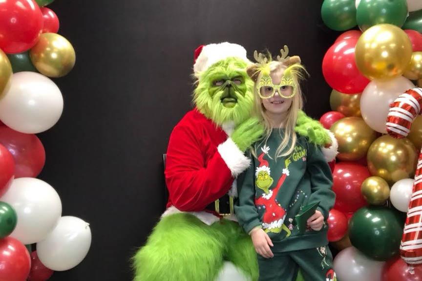 The Grinch joins second-grader Cassie Hall for a photo